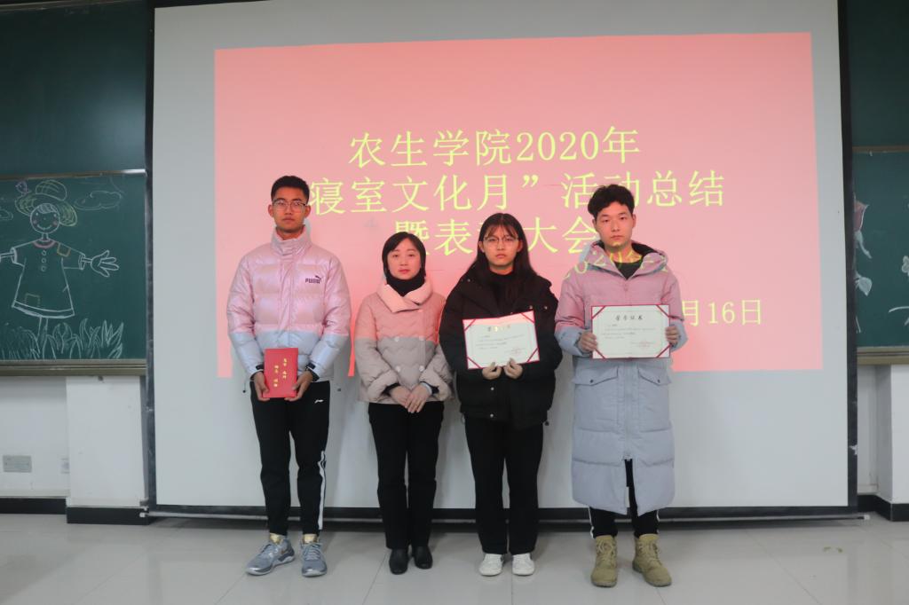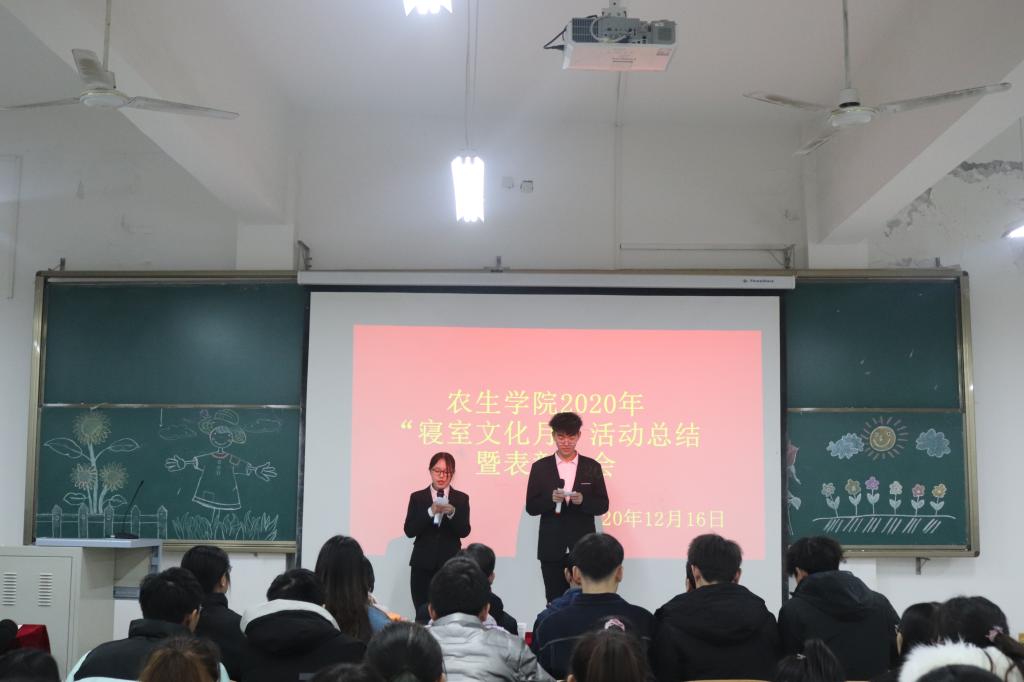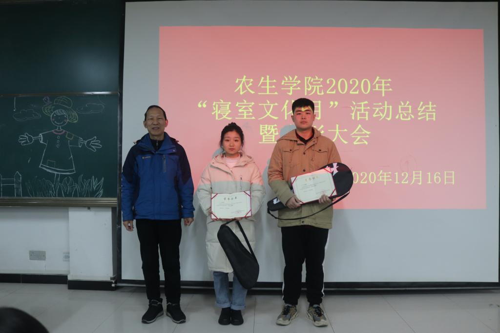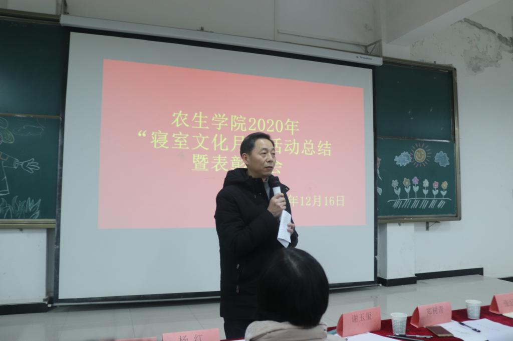 为丰富校园文化生活,加强老员工寝室文化建设,创建优良学风、舍风,营造舒适的学习生活环境,12月16日晚,英国365集团官网在1404教室举行2020年文明宿舍评比暨寝室文化月总结表彰活动。直属九党支部书记、纪委副书记、纪委办主任、监察处处长谢玉玺、审计处处长郑树青、副处级纪检员杨红莅临活动现场指导。农生公司党总支书记张纪生、副经理朱文东参加了活动。