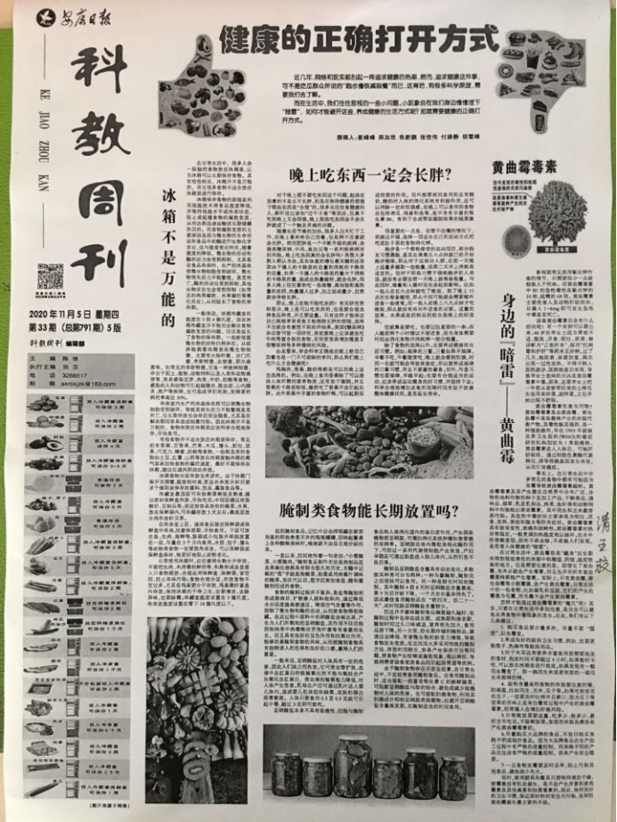 由朱新鹏、付路静老师指导,公司食品科学与工程2018级员工郑加欣撰写的“腌制类食物能长期放置吗?”、张佳伟撰写的“晚上吃东西一定会长胖?”、胡雪峰撰写的“身边的‘暗雷’——黄曲霉”三篇科普文章,在11月5日出版的安康日报科教周刊刊出。三篇文章分别从腌制类食物的安全性、存放期间的变化和科学食用,一日三餐的合理搭配和晚上可食用的食物类别,黄曲霉毒素的危害和日常生活如何避免其影响等方面,给消费者提出了很好的建议。员工通过发表文章,在服务社会的同时,也锻炼了写作能力,提高自信心,充分认识到本专业在为人民美好生活服务上的作用,为今后的学习增添动力。