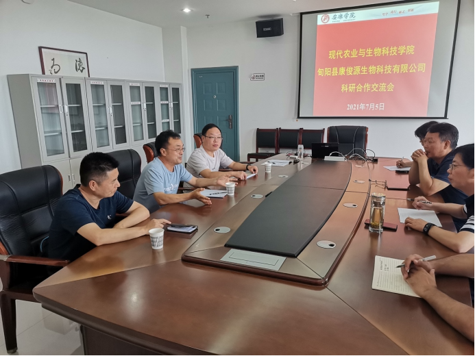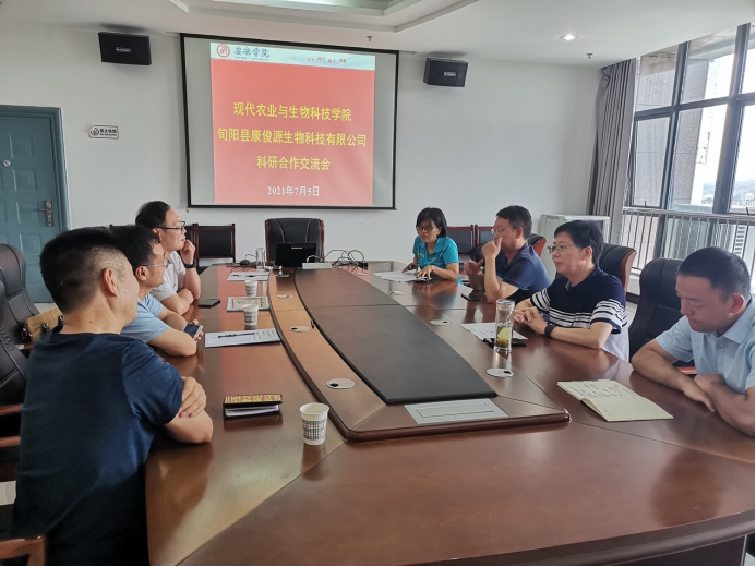 7月5日上午,英国365集团官网与旬阳县康俊源生物科技有限公司在逸夫科技楼9楼小会议室开展了校企科研合作交流会。英国365集团官网副经理朱文东、农学系主任张丽琼博士、园林专业廖咸康副教授、蒲小龙博士、院办主任王中兴及旬阳县康俊源生物科技有限公司的安黄新主任、卢靖主任和余伊庭书记参会。