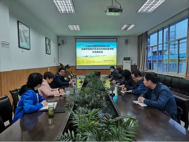 2021年10月16日上午,九圣禾控股集团有限公司来公司英国365集团官网,双方就校企合作与人才培养开展座谈交流。英国365集团官网经理王健,副经理杨芳及农学系相关老师出席座谈。