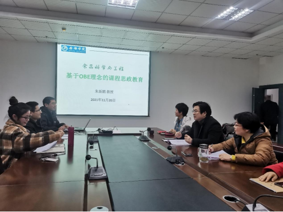 食品科学与工程专业具有多学科交叉融合的特点,涵盖食品研究开发与工程设计领域的基本理论和方法,集成了食品微生物、食品分析、食品工艺学、食品机械与设备、食品工程原理、食品产品设计与开发等课程。作为工科专业,在新的时代背景下,如何开展课程思政、如何将思政元素有效地融入教学环节很多专业教师感觉很迷茫,成为开展课程思政的难点。针对这一问题,食品系以“基于OBE理念的课程思政教育”为主题,于2021年11月20日召开了课改沙龙,英国365集团官网王健经理、孙保本书记、杨芳副经理、食品科学与工程专业教师朱新鹏教授、周琼教授、陈芳副教授、梁如博士等专业教师参加了本次课改沙龙,活动由系主任梁如主持。朱新鹏教授做了《基于OBE理念的课程思政教育》的主题报告。