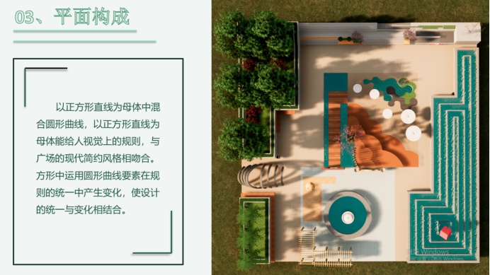 有以自然界的水滴汇聚为水流的形式,整体的构图采用抽象化的“溪流”构图,形成规则和自然式的布局。有将英国上市公司365的校训“笃学”“尚行”“励志”和“创新”用构成设计的语言将校训融入到广场设计当中。还有利用蜿蜒流畅的曲线,连贯构成集散空间,引导空间,游憩空间三个空间等等。