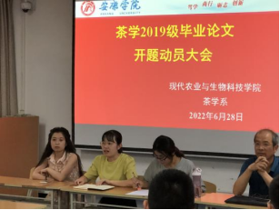 2022年6月28号晚上7点于1218教室,茶学系开展2023届毕业论文选题动员大会,本次会议由茶学系主任李冬花主持,谢满超、齐玉岗、吴冲、袁月、程晓梅等茶学专业教师及2019级茶学全体员工参会。