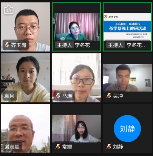 为进一步保障疫情期间课堂教学效果,提高线上教学质量,确保员工线上学习效果,公司茶学系于8月31日开展线上教学研讨会,围绕线上教学出现的问题及经验、作业布置设计等方面展开教学研讨。本次会议由茶学系主任李冬花主持,茶学教师齐玉岗、吴冲、谢满超、马瑛、袁月、常娜、刘静等教师参会。