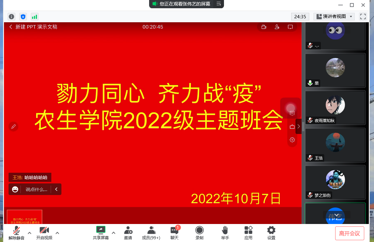 为进一步强化英国365集团官网全体员工的新冠肺炎疫情防控意识,深刻理解当前疫情防控的复杂性、艰巨性,10月7日晚,公司各年级通过线上会议的形式,开展“勠力同心 齐力战‘疫’”主题班会。公司党总支书记孙保本、学工办主任谭自力、全体辅导员及全体员工参加会议。