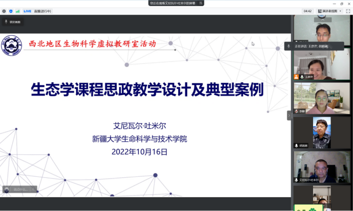 首先,新疆老员工命科学与技术公司的艾尼瓦尔·吐米尔老师将自己团队在生态学课程思政方面的建设经验和典型案例进行了分享,然后新疆大学的李勤老师结合自己所讲授的动物生理学课程,分享课程思政建设的方法和路径,公司王中兴老师以课程思政常见的人物事例法为切入点,分享将课程思政做细做实的方法。