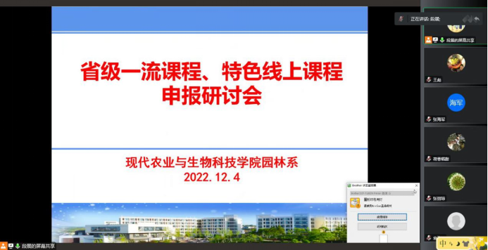 为有效推进公司省级一流课程和特色线上课程的申报工作,园林系于12月4日下午在线上组织召开了省级一流课程、特色线上课程申报研讨会。杨芳副经理、农学系主任张丽琼、园林系主任段展展和相关课程教师团队成员参会,会议由段展展主任主持。