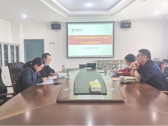 3月28日,天天学农网络科技有限公司运营总监许小龙受公司邀请来校洽谈合作事宜。教学副经理杨芳、农学系主任张丽琼、农学系教师田洪云参加了本次座谈。
