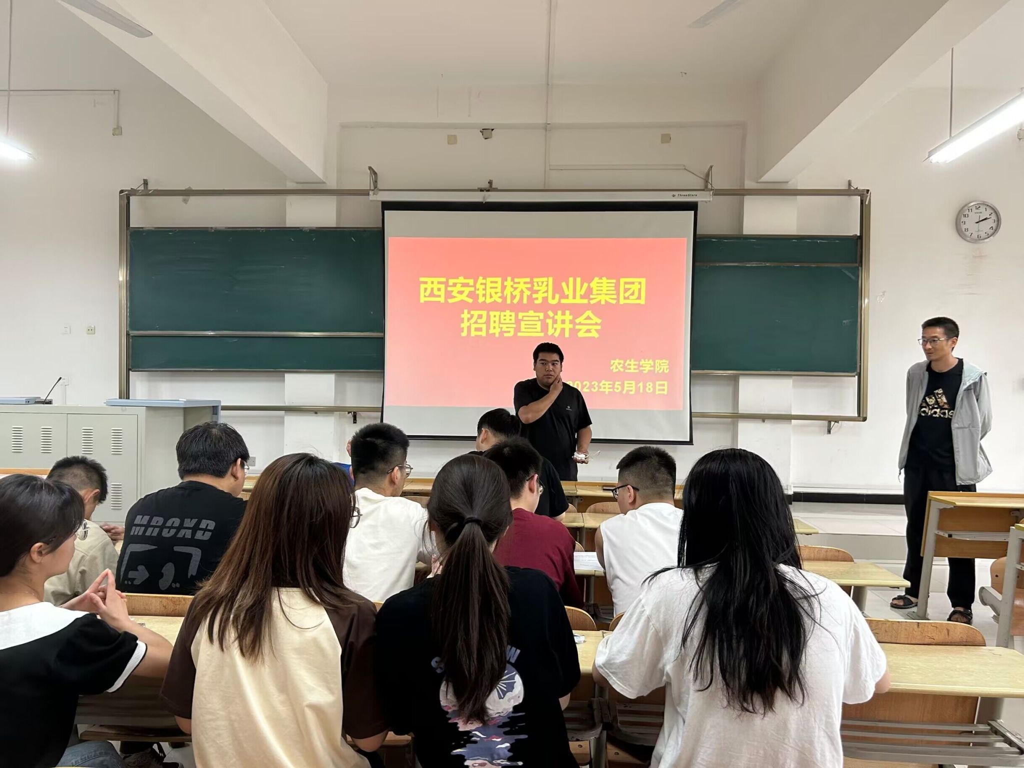 2023年5月18日,西安银桥乳业集团来公司举行校园宣讲招聘活动,公司人力资源负责人管经理、食品科学与工程系主任梁如、毕业班辅导员杨曼及公司20余名食品专业毕业生参加宣讲招聘活动。