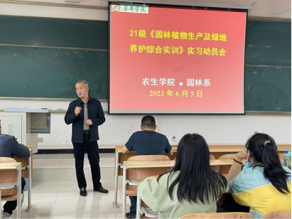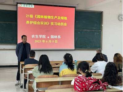 2023年6月5日,在江北校区1号教学楼1204教室,园林系召开了2021级园林植物生产与绿地养护综合实习动员会,2021级园林专业全体员工参加了大会。会议由张海军老师主持,袁海龙教授、金清民老师和张桂粉老师参加了会议。