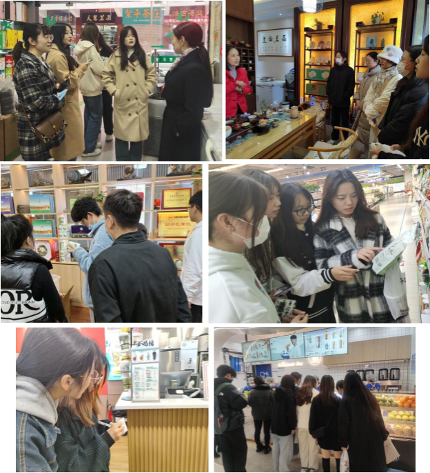 整个实习过程分为四部分内容,首先,同学们分别前往培新街、金州国际城、香溪洞等安康市区茶叶市场,了解安康市区茶叶专卖店销售茶叶的品类、特色、价格区间、包装、市场定位、目标客户、销售渠道、促销方式等。接着,到蜜雪冰城、茶百道、霸王茶姬、悸动烧仙草、沪上阿姨等茶饮品店了解茶相关产品的品类、特色、价格区间以及促销方式,再到万友超市、永辉超市、喜盈门中心店等商场超市了解茶叶、茶饮料、茶食品、茶用品等相关产品及其销售情况,最后在校内调研公司老员工对安康茶产业了解以及购茶、饮茶情况等。实习期间,同学们积极参与调研,大胆、巧妙与人员沟通,团结协作,并认真做好记录。