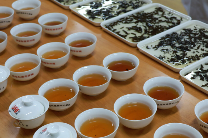 本次赛事参赛茶样由武夷大红袍、武夷水仙、武夷肉桂等共30份,评审团由专家评委(80%)和大众评委(20%)组成,茶学系专业教师李冬花、程晓梅、袁月、尹旭超、刘静组成专家评委,茶学21级全体员工及23级部分员工组成大众评委。以密码审评的方式,依照国家标准GB/T 23776-2018《茶叶感官审评方法》,对茶样外形、汤色、香气、滋味、叶底5个因子进行审评打分。审评现场,专业评委们严格把控投茶量、茶水比例和冲泡时间,对每个茶样认真品评,反复斟酌对比;参与品评的员工们共品共赏、相互交流、认真打分,整个活动共历时约3小时。