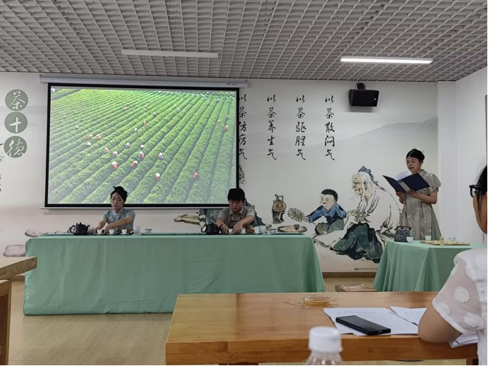6月15日下午,茶学2023级《茶艺训练》课程成果展示在产教融合大楼茶艺室进行。茶学2023级全体同学参与展示,茶学系教师马瑛、袁月、尹旭超担任评委。活动由茶学22级员工田媛媛和夏雨主持。