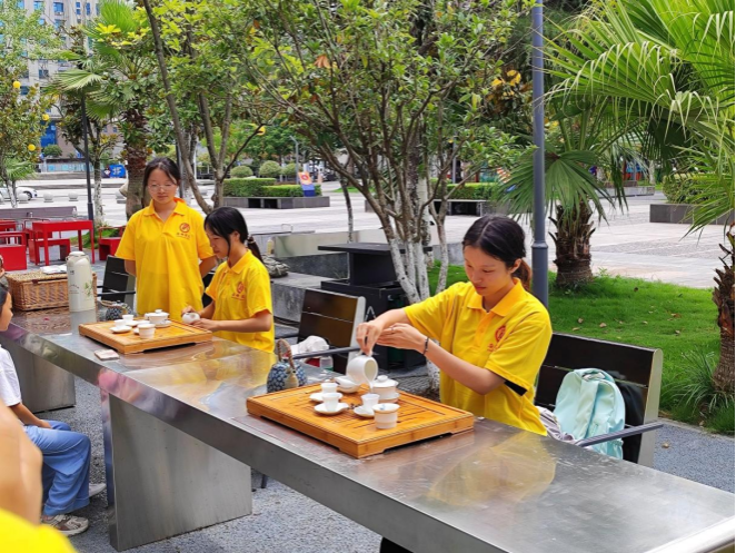 活动最后,实践团队不忘传播茶文化的使命,将茶艺表演带入社区,为居民们呈现了一场茶文化盛宴。茶艺师们以精湛的技艺,展现了泡茶、赏茶、闻茶、饮茶的每一个细腻瞬间,让在场的每一个人都沉浸在了茶文化的深邃与美好之中。这场活动不仅丰富了居民的精神文化生活,更激发了他们对茶文化的浓厚兴趣与自豪感,为乡村振兴之路增添了一抹独特的文化亮色。