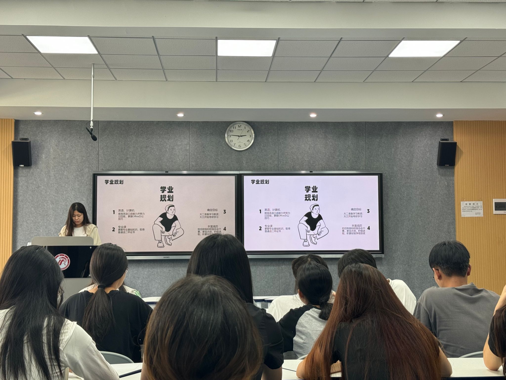 班会中,郭杨娟从自我认知、职业认知、外界因素、制定并实施职业规划这四个方面来为同学们讲解如何确定自身未来的发展道路,随后,由参会员工自由提问。针对员工们提出的一系列具有代表性的问题,郭杨娟主要从转变、成长、选择、破局这四个方面为大家一一解答。她指出,在大学四年的时间里,各位同学应当尽快转变思维方式,适应新的环境与角色;抓紧一切学习的机会,利用好时间及资源,打好专业基础,提升综合素质,让自己得到真正成长与蜕变。同时,郭杨娟还通过分析专业优势、就业形势等,向同学们提出了考公、考编、直接就业等多条毕业去向道路,积极引导新生们对未来制定一个详细的计划,规划好个人的职业生涯,让自己大学四年有个完美的开始和圆满的结束。最后,23级的每位同学上台分享,定方向,做规划,在了解自身和专业的情况下,主动思考未来发展方向,从而锚定未来发展的方向。