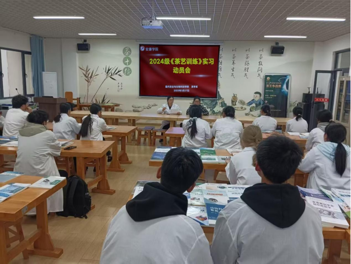 3月27日下午,2024级茶学茶艺训练实习动员会在产教融合大楼茶艺室顺利举行。茶学系主任李冬花、指导教师马瑛及2024级茶学专业全体员工参会。