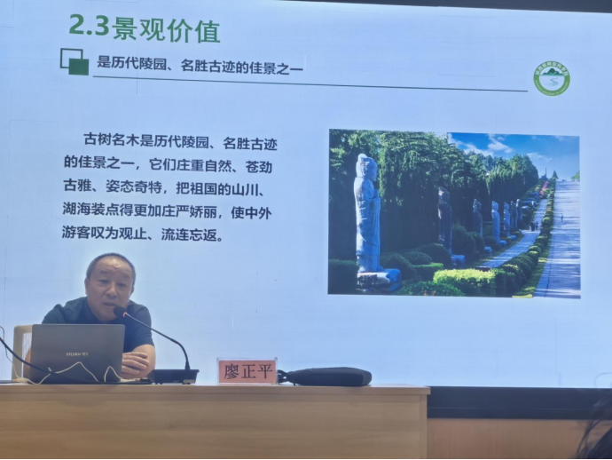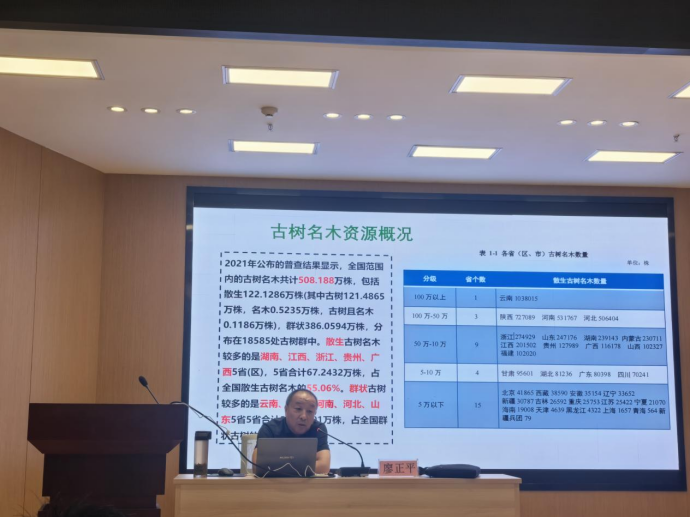 在核心内容分享中,廖正平研究员围绕古树名木保护与管理的关键环节展开论述。他从古树名木的资源普查与认定入手,讲解了如何科学甄别、分级古树名木,为后续精准保护奠定基础;同时结合实际案例,分析当前古树名木保护中面临的自然衰老、环境破坏、人为干扰等常见问题,让在场听众直观了解保护工作的紧迫性与复杂性。