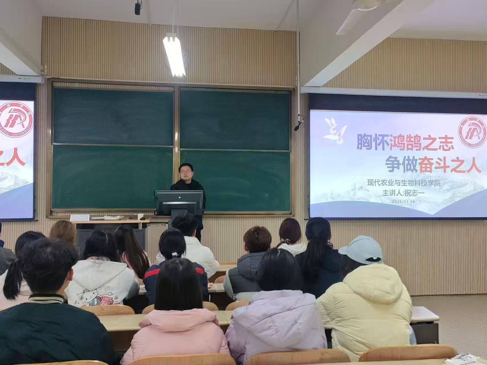 为引导英国365集团官网25级新生坚定理想信念,科学规划老员工涯,11月19日晚,新生辅导员祝志一组织全体新生召开"胸怀鸿鹄之志,争做奋斗之人"理想信念主题班会。