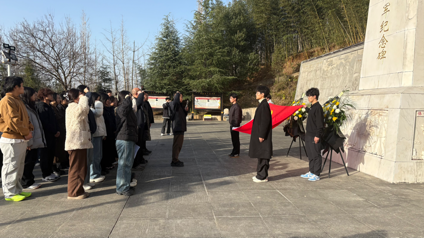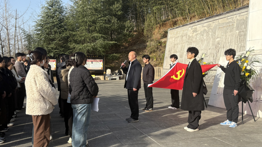 随后,全体人员前往陕南人民抗日第一军纪念碑。大家整齐列队,敬献花篮、肃立默哀,深切缅怀为民族解放英勇献身的革命先烈。员工党支部书记邓子序现场讲述了陕南人民抗日第一军的组建背景与战斗历程,革命先辈忠诚报国、不畏牺牲的事迹,让全体党员接受了一次深刻的党性教育与精神洗礼。在庄严肃穆的氛围中,辅导员祝志一带领全体党员面向党旗,重温入党誓词。铿锵誓言回荡在纪念碑前,进一步坚定了大家“听党话、跟党走”的理想信念与使命担当。