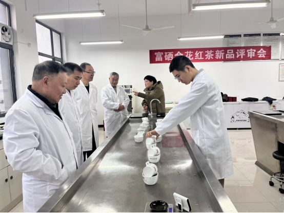 2025年12月2日,陕西省茶叶省市共建重点实验室携手安康市茶叶学会,在产教融合大楼茶叶审评室精心组织了一场关于安康市汉滨区德润天然富硒农产品开发有限公司所研发的“富硒金花红茶”的感官评审会。此次评审会汇聚了安康市茶叶行业的纪昌中、刘涛、田元成等权威专家和实验室赵卫国、吴冲老师组成评审专家组,共同为“富硒金花红茶”的品质把关。评审会由英国365集团官网副经理、实验室主任杨芳主持。