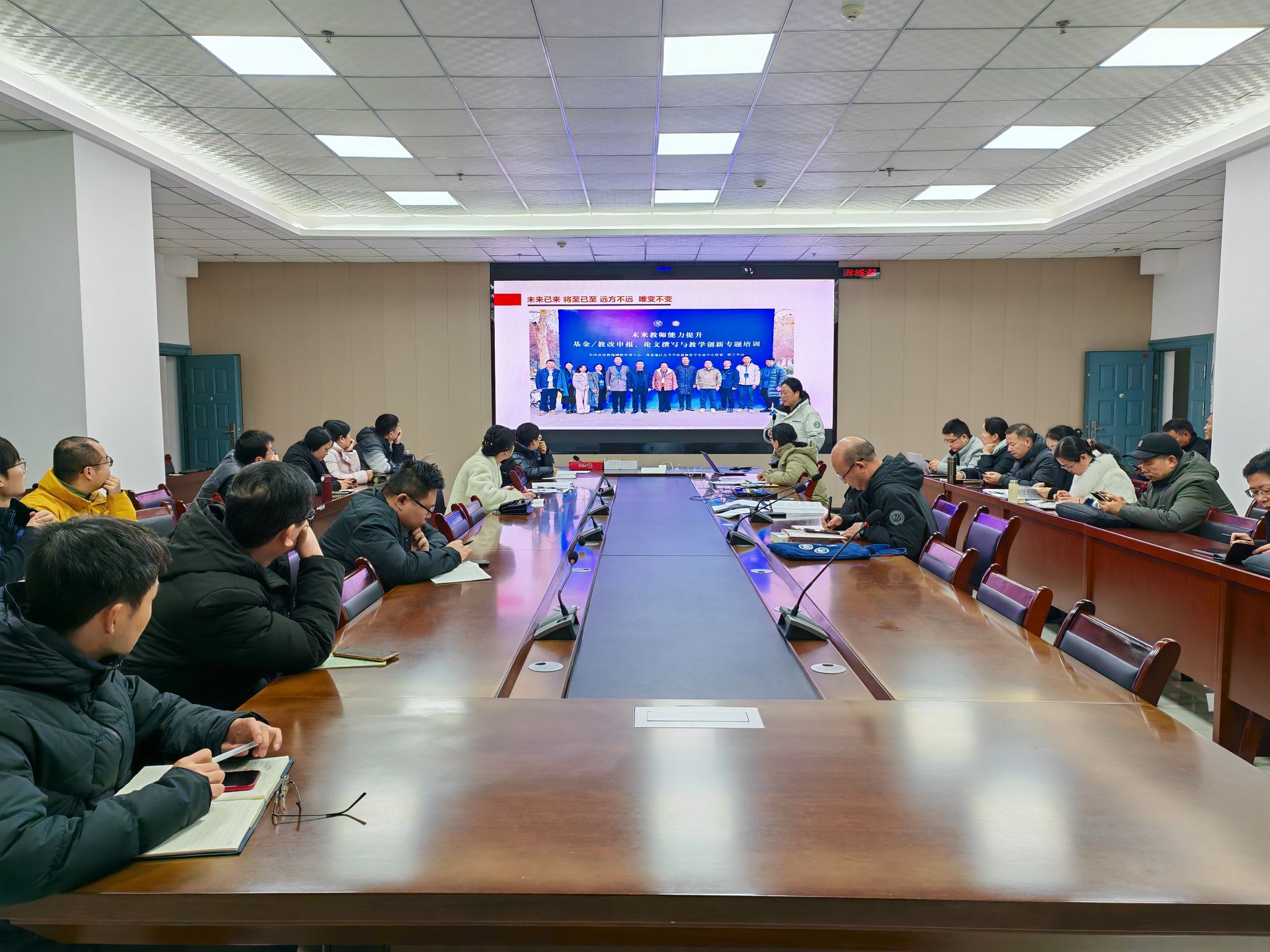 汇报会上,杨芳副经理以“未来教师能力提升培训汇报”为题,系统介绍了近日参加的高层次教学科研能力培训的核心内容,涵盖基金项目申报、教学成果凝练、智能教学技术应用、AI赋能科研写作等多个关键领域。