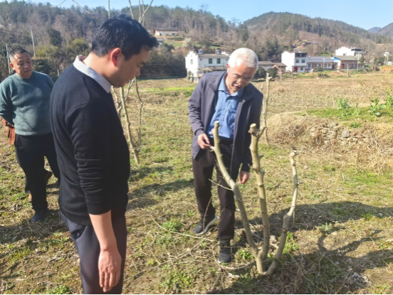 在实地调研中,团队发现该合作社果桑园内的桑树主干较高,给桑椹成熟后的采摘带来一定困难。针对这一问题,彭云武研究员结合地形条件,因地制宜为园区确定了主干与次级枝干的合理高度,并详细讲解了定干操作的关键技术要点和注意事项。同时,还询问了园区往年菌核病的发生与防控情况。随后,张笙源老师围绕菌核病的危害特征、识别方法及防控措施,对现场社员进行了科普讲解,帮助提升园区病虫害综合管理水平。