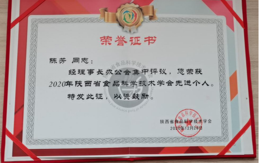 公司陈芳副教授在会上被评为2020年度学会的先进个人。陈芳老师近年来在科学研究、服务安康食品产业等方面作了大量工作,本次被省食品科学技术学会评为先进个人,是对其工作成绩的肯定。