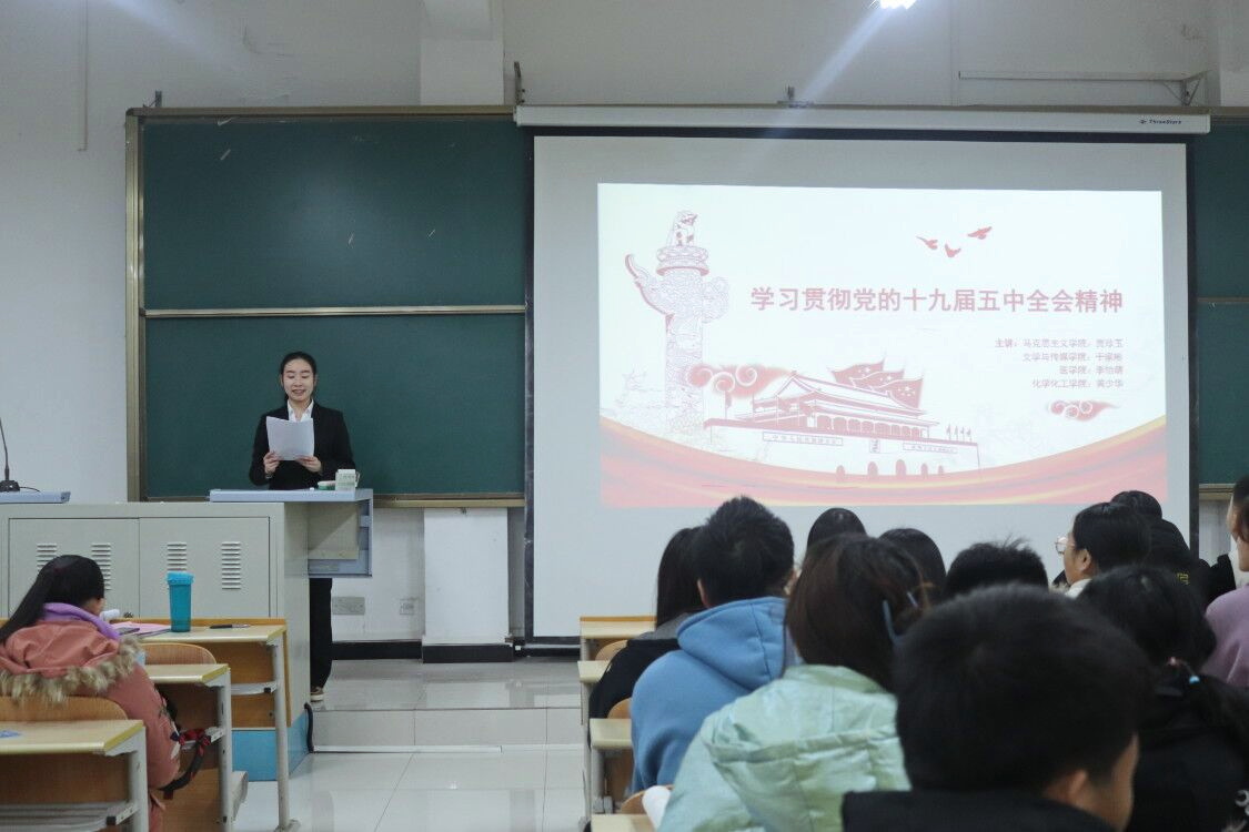 四名宣讲团成员紧紧围绕“党的十九届五中全会精神”,从会议基本概况、重大意义、取得的最重要成果,以及决胜全面建成小康社会取得的决定性成就、2035年远景目标和“十四五”时期主要目标任务等方面,用同学们喜闻乐见、易于接受的认识逻辑、表现形式、话语体系宣讲全会精神,用“小环境”解说“大形势”,用“身边事”解读“大政策”,用“小故事”阐明“大道理”。